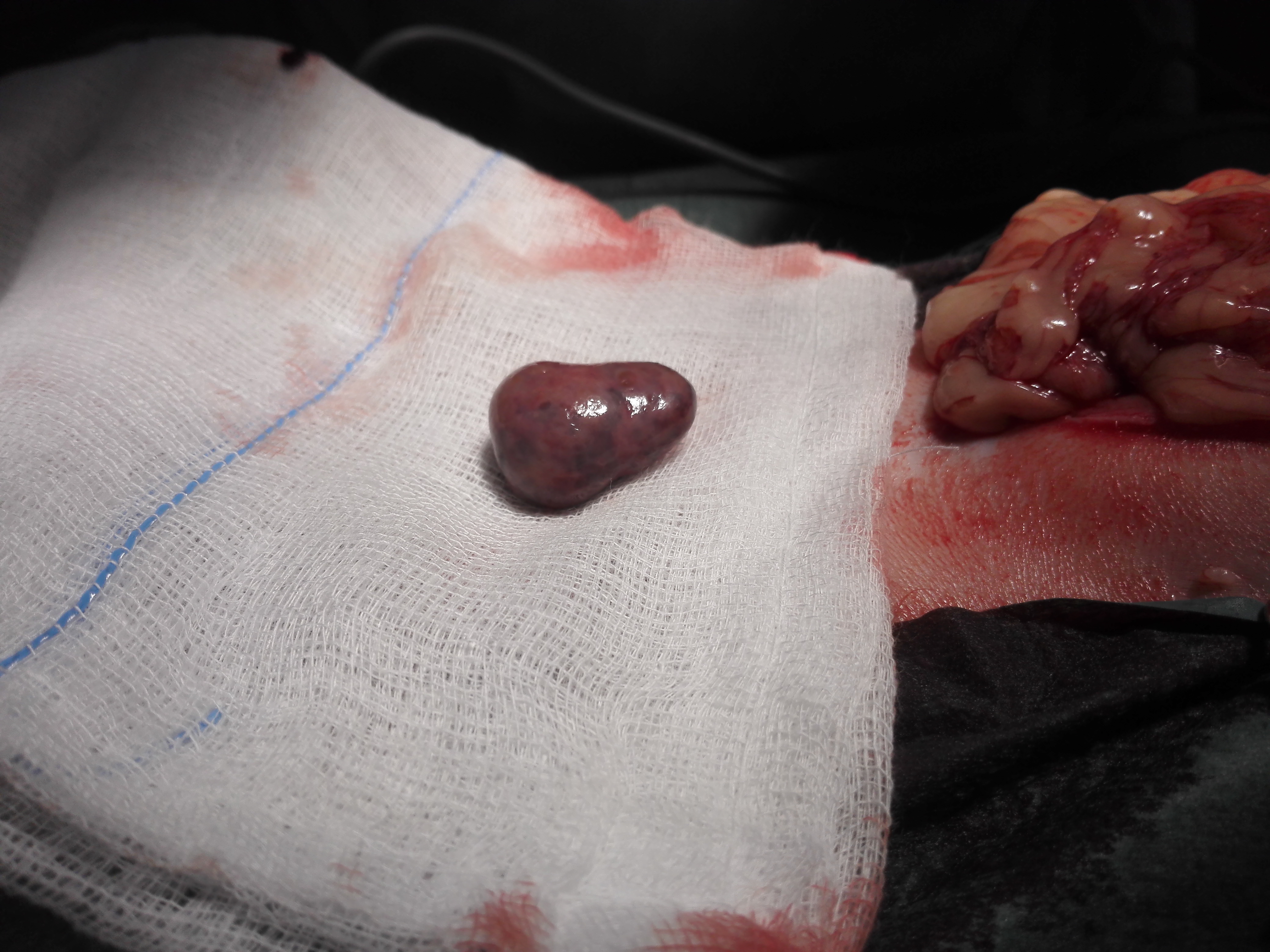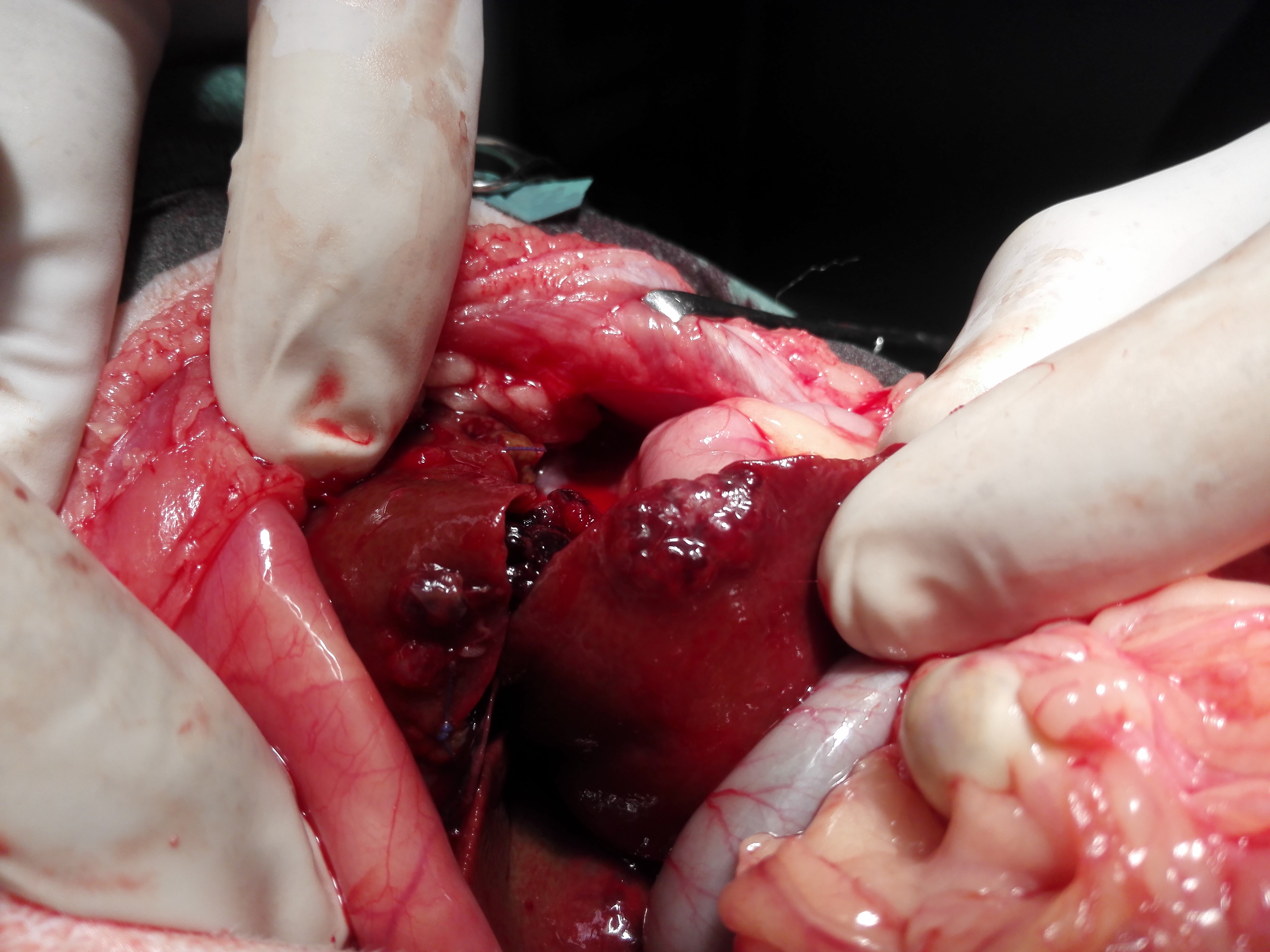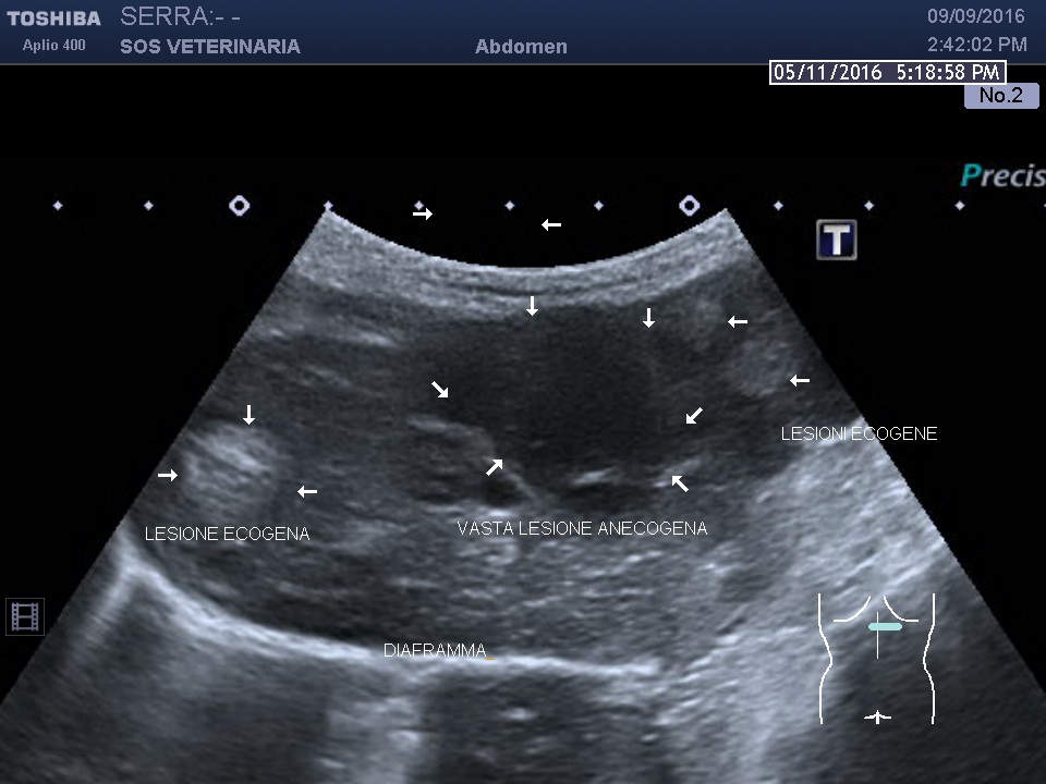 Gatta comune europea ,eta’ 5 anni ,improvvisa debolezza,vive in casa ,alla visita: mucose pallide,lieve distensione addome ,l’ecografia di base evidenzia emoperitoneo (versamento campionato) e due masse di alcuni centimetri ipoecogene peritoneali a profilo uniforme avascolari al color doppler , lesioni focali epatiche alcune molto demarcate ed ecogene altre consistenti in aree piu’ o meno demarcate con settori ane-ipoecogeni e settori ecogeni , demarcazione del profilo dei lobi nelle porzioni caudali meno definito.
